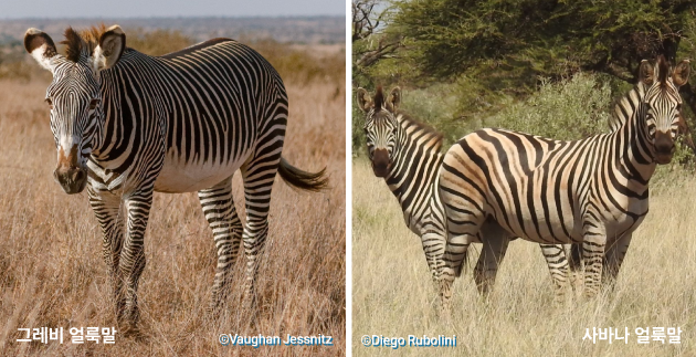 아프리카에만 사는 얼룩말, 이름에 ‘말’이 들어가지만 유전학적으로는 당나귀에 더 가깝다고 해요. 울음소리도 말처럼 ‘히이잉~’하는 것이 아니라 강아지처럼 ‘왕왕, 컹컹’ 한다거나 당나귀와 비슷하답니다. 검은색과 흰색 줄무늬가 있는 외형이 멋있는 얼룩말은 한 종일 것 같지만, 얼룩말아속(Hippotigris)은 서식지와 줄무늬에 따라 크게 그레비얼룩말·사바나얼룩말·산얼룩말 이렇게 세 종류로 나뉘어요😲 |