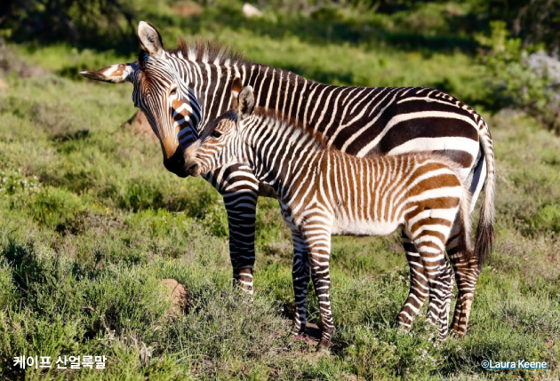 - 케이프 산얼룩말(Cape mountain zebra, Equus zebra zebra Linnaeus) 말과 비슷하게 생겼으며, 하트만 산얼룩말보다 크기가 작아요. 몸통의 검은색 줄무늬는 엉덩이 부분의 줄무늬보다 좁고 배까지 이어지지 않으며, 옆구리 아랫부분에서 갑자기 끝납니다. 꼬리 윗부분에 격자 모양의 가로 줄무늬가 있고, 다른 얼룩말 종보다 귀가 크다고 해요. 한때 야생에 100마리도 남지 않아 멸종 직전이었으나, 남아프리카 공화국의 강력한 보호 정책 덕분에 현재는 3,000마리 이상으로 늘어나 IUCN 적색 목록 최소관심(Least Concern, LC)으로 분류되어 있어요.